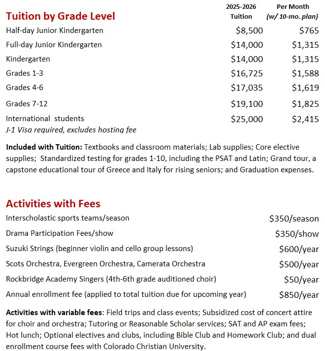 Rockbridge Academy does not offer any multi-student, pastoral or military discounts. In the spirit of coming alongside families in the education of their children, our Tuition Affordability program offers a personalized approach to managing the cost of tuition for each family. Please click the "Affording Tuition" button to read about the Tuition Affordability program.