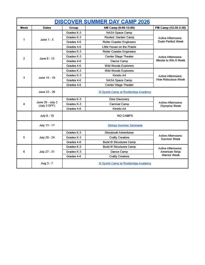 Check out the calendar below to see each week's camp information. Please note the appropriate grades and times listed.